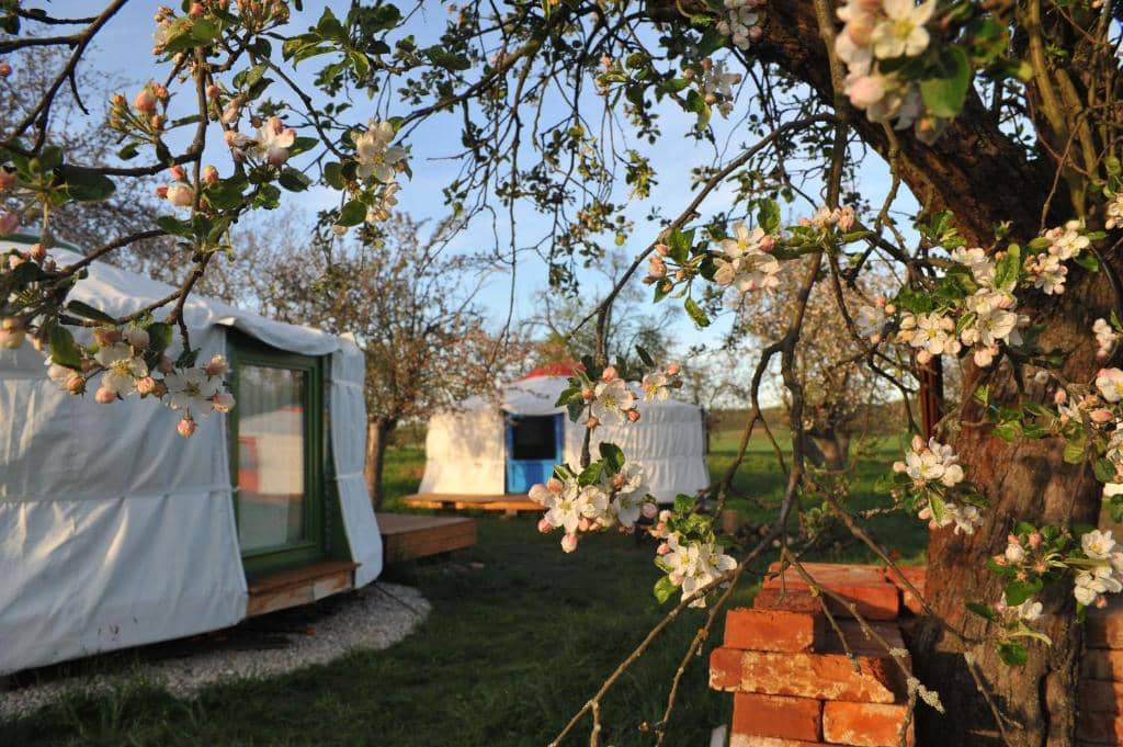 Jurty jsou zasazené přímo do sadu plného stromů a zeleně, což vytváří ideální prostředí pro odpočinek a zpomalení tempa. V létě si můžete posedět na venkovní terase, vychutnat si snídani v trávě nebo večer pozorovat hvězdy. Ticho a minimum rušivých vlivů dělají z tohoto místa ideální destinaci pro ty, kteří chtějí uniknout z každodenního shonu.